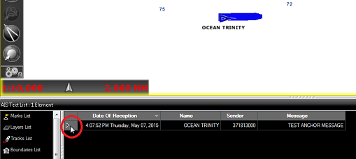 Lorsque qu'une cible AIS reçoit un message texte, celui-ci s'affiche automatiquement dans TimeZero. Une notification apparaît dans la barre d'état et affiche le message suivant : "AIS Message texte reçu de : xxxxx" (le "xxxx" est le numéro d'identification MMSI de la cible qui a envoyé le message), et le message est ajouté à la liste "Texte AIS". Vous pouvez cliquer sur la liste des message AIS (sur le côté gauche de la liste) pour retrouver sur la carte la cible qui a envoyé le message :