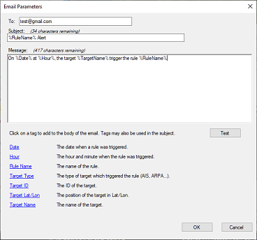 Exemple d'argument en sortie (avec une cible AIS) : AIS 206124607 35-12.9448-N, 139-46.7543-E 22-06-2012 00:38:18 "Rule Name" "M/V Navire".