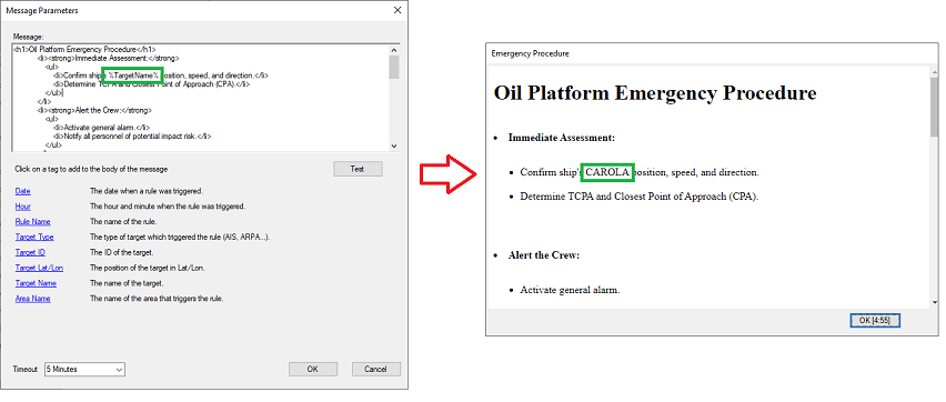 - Afficher un message : affiche à l'opérateur un message dans une fenêtre dédiée. Le message peut être formaté à l'aide de balises HTML et peut contenir des "smart-tags" qui remplaceront dynamiquement leur contenu en fonction des informations ciblées. Cette fonction est utile lorsque vous souhaitez afficher des instructions détaillées ou une procédure de workflow à un opérateur lorsqu'une règle est déclenchée.