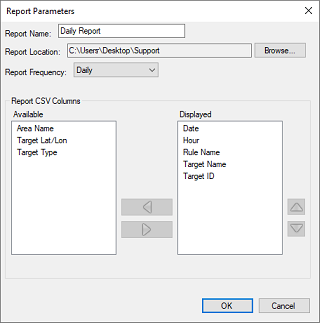 - Ajoutez des informations à un rapport CSV : ajoutez une entrée à un fichier CSV pour générer des rapports contenant des informations sur les règles et les cibles. Vous pouvez spécifier un préfixe de nom pour le fichier et définir les colonnes CSV incluses dans le rapport. Vous pouvez également définir la fréquence de génération du rapport sur quotidienne, hebdomadaire ou mensuelle. Chaque fichier de rapport se termine par une date courte lorsqu'il est créé. Lorsqu'un nouveau fichier de rapport est généré en fonction de la fréquence sélectionnée, le nom du fichier précédent est mis à jour et la mention « terminé » est ajoutée.