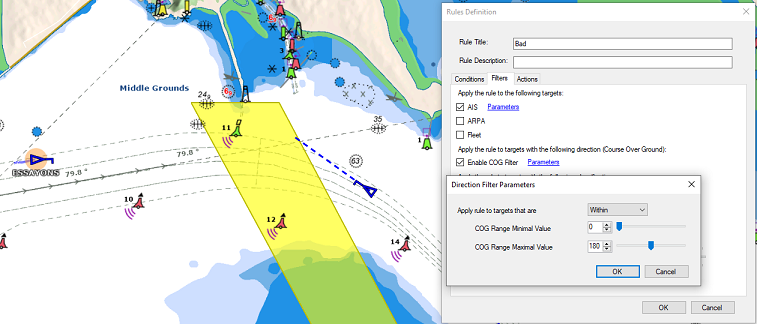 Un filtre de direction basé sur le COG (Course au sol) peut être activé. En cliquant sur le bouton "Paramètres", vous pouvez définir un secteur et spécifier si la trajectoire de la cible doit se trouver à l'intérieur ou à l'extérieur de ce secteur pour déclencher la règle. Dans l'exemple ci-dessous, seul le navire nommé « Essayons » activera la règle, car son COG est d'environ 80 degrés, ce qui correspond au secteur de 0 à 180 degrés défini dans le filtre COG. Le navire situé à droite ne déclenchera pas la règle, car son COG est d'environ 300 degrés.