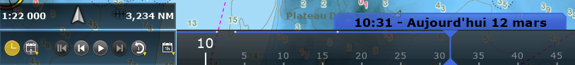 Espace "Analyze" : cet espace de travail permet de rejouer les données qui ont été auparavant enregistrées (le module Enregistrer et rejouer est requis), d'afficher les prévisions météorologiques et les prévisions concernant la hauteur et les courants de marées. L'espace de travail "Analyze" dispose d'une barre de contrôle d'animation VTC (et d'une barre de temps en bas de l'écran) qui permet de prévisualiser les différentes animations en changeant l'heure et la date.