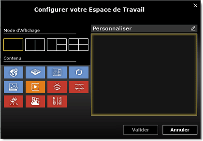 Dans un premier temps sélectionnez un mode d'affichage à l'écran (mode plein écran ou partagé) puis sélectionnez le ou les mode (s) d'affichage que vous souhaitez inclure dans votre espace de travail. Notez qu'en mode plein écran, l'espace de travail prend par défaut le nom du type d'affichage que vous venez de choisir. Vous pouvez renommer ce nouvel espace de travail si vous le souhaitez. Toutefois il est fortement conseillé de le renommer pour lui donner un nom plus significatif pour vous. Cliquez dans la zone de texte "Personnaliser" de la boîte d'édition pour saisir ce nom.
