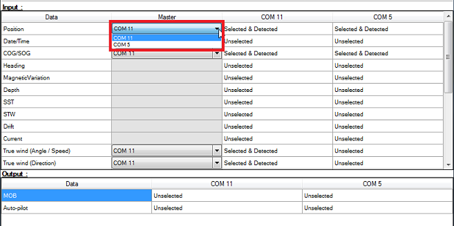 Si le même type de données a été sélectionné sur plus d'un port, un menu déroulant (dans la colonne du "Maître") vous permet de sélectionner le port à utiliser comme équipement principal (qui sera le port utilisé pour cette donnée spécifique dans TIMEZERO) :