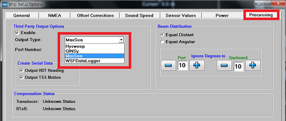 Cliquez sur l'onglet "Processing" dans les réglages du bateau (Ship Setup) et sélectionnez "MaxSea" dans les options "Third Party Output Options :