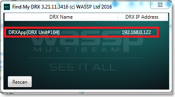 Pour connecter le système WASSP (DRX) à TIMEZERO, vous devez assigner une adresse IP au DRX via l'interface Web DRX. Pour accéder à l'interface Web du DRX, vous devez connecter l'ordinateur au DRX (directement ou via un routeur). S'il n'y a pas de routeur sur le réseau, le WASSP DRX et le PC utiliseront une adresse IP attribuée par défaut : 169.254. x. x. Pour trouver l'adresse IP du DRX, vous pouvez utiliser l'outil "Find My DRX" qui est fourni avec le logiciel WASSP.