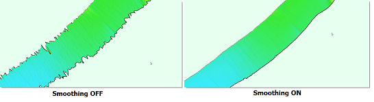 Le niveau de lissage PBG ajuste le post-traitement TIMEZERO des données de Bathymétrie et de Dureté (Backscatter) du WASSP. Le lissage aidera à corriger les imprécisions d'humidité (petite erreur) et améliorera le rendu des contours :