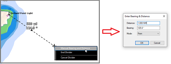 Sometimes, you may need to manually input the distance and bearing to or from an object. To do this, select the divider tool and click once on the object. With the tool still active, right-click to open the contextual menu and choose "Manual Bearing and Distance". A window will appear where you can enter the desired parameters. Click OK to confirm. This action will create the second point of the divider according to the specified parameters: