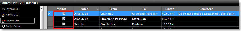 Note: It is not possible to hide the Selected (Planning). The Planning Route will always be displayed on the chart even if the route has been hidden. If you want to hide the planning route, right click anywhere and select "unselect all".