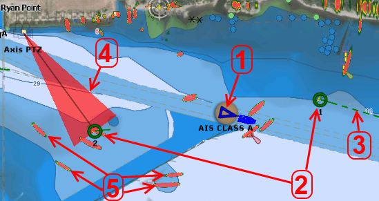 Camera Field of View ("FOV"): When a Pan, Tilt and Zoom ("PTZ") camera is configured in TimeZero, a cone will be displayed on the screen indicating where the camera is looking at.