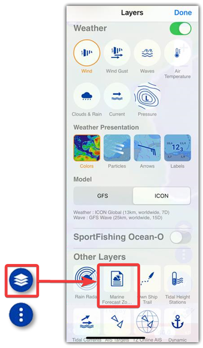 To display the Marine Forecast Zones layer tap on the “Layers” button located on the bottom right of your screen and select "Marine Forecast Zone" from the “Other Layers” section: