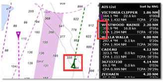 When you assign a custom color to an AIS target, either by right-clicking on it and chaging its color, or by adding it to your AIS Directory with a predefined color, the color of the target will appear at the edge of the NavData as shown below: