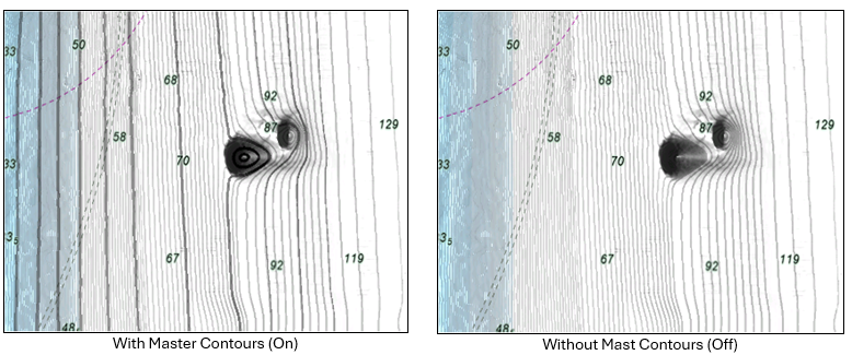 BathyVision displays multiple contour lines, with certain ones emphasized as "master contour lines" shown in bold. If you prefer not to highlight these specific lines, you can disable them by unchecking the “Display Master Contours” checkbox in the Plotter Display Options under the BathyVision section: