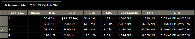 After activating a route, and as long as no other planning route is selected, the Route Detail list displays information related to the active route. The Route Detail list for the active route is very similar to the planning route detail list, with a few differences: the first line always corresponds to the active leg (completed legs are no longer displayed in the list), and the date is fixed to the route activation time and cannot be modified.