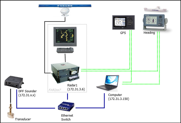 Note that it is possible to connect NavNet sensors (such as a DFF1-UHD sounder) to the same network so that TimeZero can display Radar and Sounder Echo: