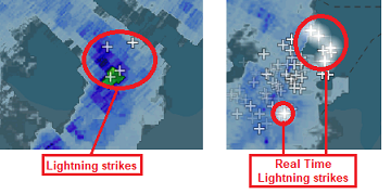 New lightning strikes are briefly highlighted, while older ones gradually fade rather than disappearing abruptly. The lightning display time window is user-configurable from 10 to 60 minutes (30 minutes by default) in the Weather Options.