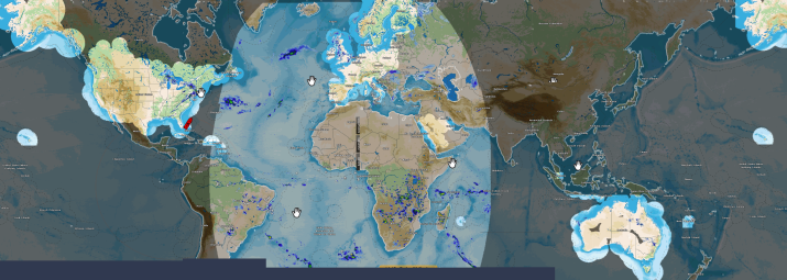 The Rain Radar combines two complementary data sources: ground radar, which provides high-resolution precipitation data in coastal areas, and EUMETSAT satellite precipitation (MSPE H60B), which extends coverage offshore beyond the range of terrestrial radar over the Atlantic ocean. To ensure clear interpretation, the display distinguishes three coverage levels when the Rain Radar & Lightning Strike is displayed: ground radar coverage (no mask), satellite-only coverage (light mask), and areas with no available data (dark mask):