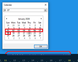 Once TimeZero has opened, select the Planning WorkSpace to review the recorded data. Radar overlay and target display must be enabled from the Ribbon to ensure all recorded information is shown. Adjusting the playback timescale to “Week” simplifies navigation. Available recordings are indicated by a blue bar along the timeline. When opening the Calendar view, the days containing recorded data appear slightly bolder, making them easier to identify: